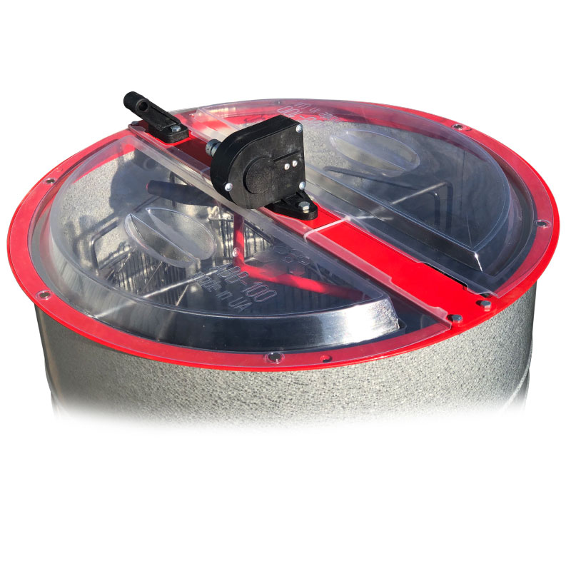Крышка для медогонки изготовлена из плотного пищевого пластика, его толщина 0,8 мм. Состоит из двух половинок, имеет выемки под ручки. Крепится к обручю медогонки за счет специальных магнитов, плотно прилегает к медогонке.