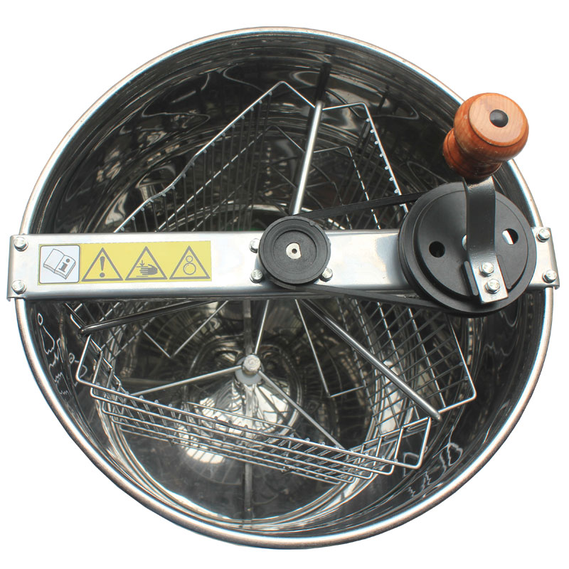 Медогонка оцинкованная неповоротная Дадан: ротор выполнен из круглого прутка СТ 3 диаметром 8мм. На роторе наварены кассеты, которые имеют патентованную конструкцию, что обеспечивает сохранность сот от непоправимых повреждений при качке мёда на высоких скоростях. Кассеты изготовлены из круглых прутков СТ 3 диаметром 3мм (продольные прутки) и 4мм (поперечные прутки). Ротор и кассеты покрыты полимерной порошковой краской. Ёмкость медогонки изготовлена из листа оцинкованной стали, толщиной 0,5мм, имеет конусообразное днище, что в совокупности с несколькими поперечными рёбрами обеспечивает достаточно высокую жёсткость. Слив мёда осуществляется через пластиковый кран Ду55. Траверса изготовлена из листа СТ 3 толщиной 2,5мм и покрыта полимерной порошковой краской.