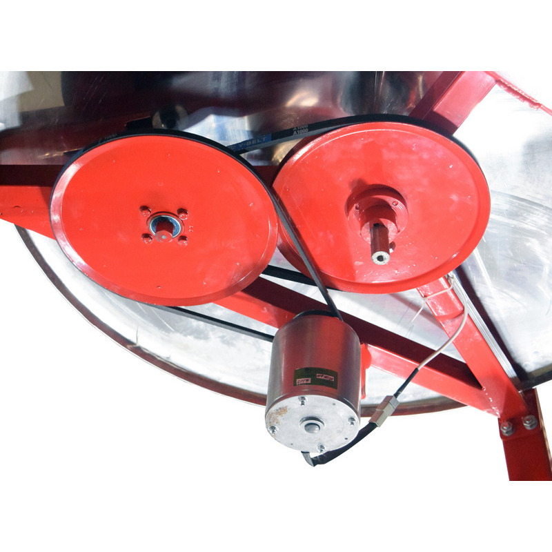 Привод медогонки состоит из электродвигателя и 2-х ступенчатой ременной передачи, закрытой кожухом. Питание электродвигателя 24В, постоянного тока, может осуществляться от сети переменного тока 220В через трансформатор-выпрямитель, который установлен в нижней части медогонки, либо от двух последовательно включенных аккумуляторов 12В.