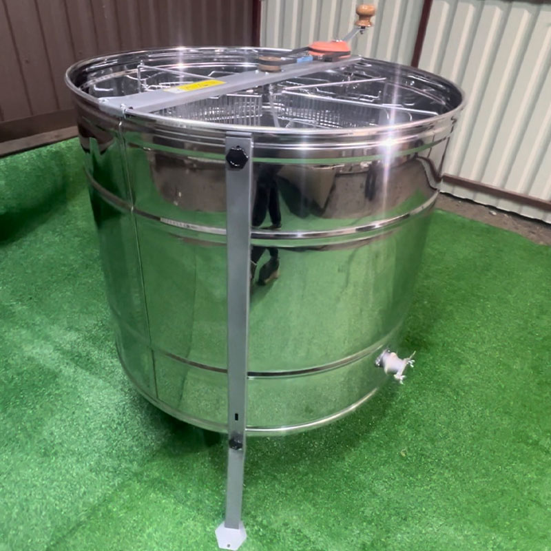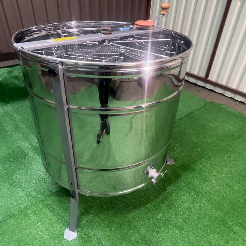 Медогонка нержавеющая (марка стали AISI 430) поворотная Дадан 6-ти рамочная: ротор выполнен из круглого прутка Ст 3 диаметром 10мм. Нижняя опора, верхняя и нижняя оси ротора выполнены из круглого прутка Ст 3. Ёмкость имеет конусообразное днище, выполнена из листа нержавеющего листа стали марки AISI 430 толщиной 0,5мм, что в совокупности с несколькими поперечными рёбрами обеспечивает достаточно высокую жёсткость. Слив мёда осуществляется через нержавеющий кран.