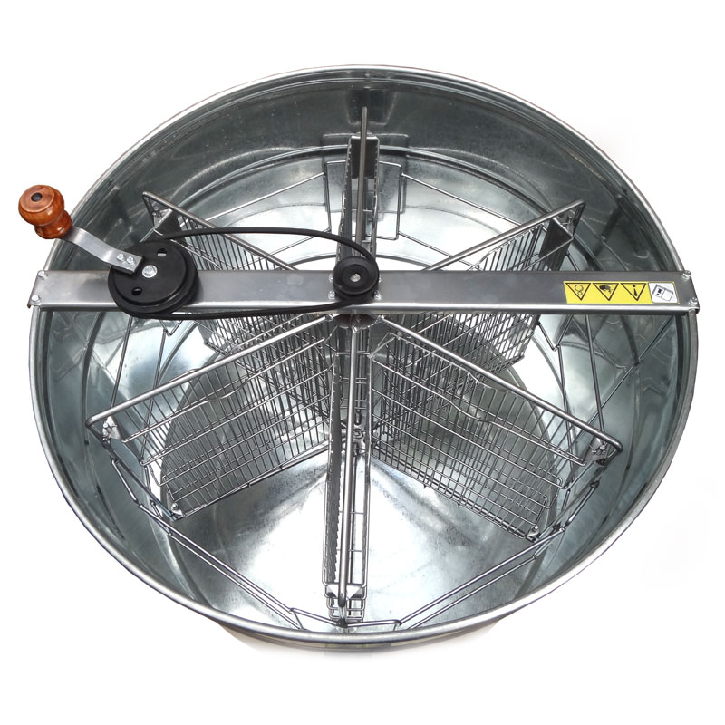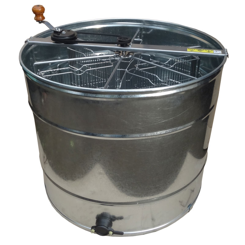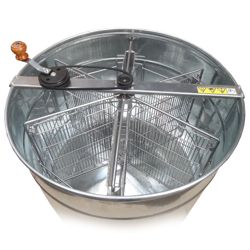 Медогонка оцинкованная сталь поворотная Дадан, 6-ти рамочная: ротор выполнен из круглого прутка Ст 3 диаметром 10 мм. Нижняя опора, верхняя и нижняя оси ротора выполнены из круглого прутка Ст 3. Ёмкость имеет конусообразное днище, выполнена из листа оцинкованной стали толщиной 0,5мм, что в совокупности с несколькими поперечными рёбрами обеспечивает достаточно высокую жёсткость. Слив мёда осуществляется через пластиковый кран.