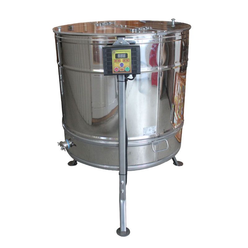 Медогонка нержавеющая (марка стали AISI 304) автоматическая под рамку Дадан 6шт. или пулурамок 12шт. Ротор выполнен из прутка нержавеющей стали марки AISI 304 диаметром 16мм, лучи ротора и звёздочки и оси кассет -.Поворотные кассеты имеют патентованную конструкцию, которая обеспечивает сохранность сот от непоправимых повреждений при качке мёда на высоких скоростях. Кассеты изготовлены из круглых прутков нержавеющей стали марки AISI 304 диаметром 3мм (продольные прутки) и 4мм (поперечные прутки). Опора ротора выполнены из круглого прутка нержавеющей стали марки AISI 304. Ёмкость изготовлена из нержавеющего листа стали AISI 304 толщиной 0,5мм. Дно имеет конусообразную форму, выполнено из нержавеющего листа стали марки AISI 304 толщиной 0,8мм. Ёмкость усилена рёбрами жёсткости. Слив мёда осуществляется через кран Ду40 из стали марки AISI 304. Траверса и подставка изготвлены из листа стали 3 толщиной 2,5 мм и покрыты полимерной порошковой краской. Ёмкость закрывается сверху крышкой из оргстекла.