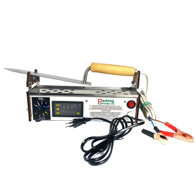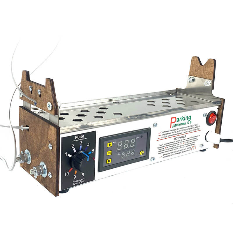 Паркинг, для электрического ножа «Гуслия». С функцией электронаващивателя – предназначен для поддержания установленной температуры ножа «Гуслия» от 70 до 120 ℃, предотвращает перегрев и сгорание ножа в режиме ожидания. Также паркинг может использоваться в качестве электронаващивателя, для наващивания пчелиных рамок вощиной.