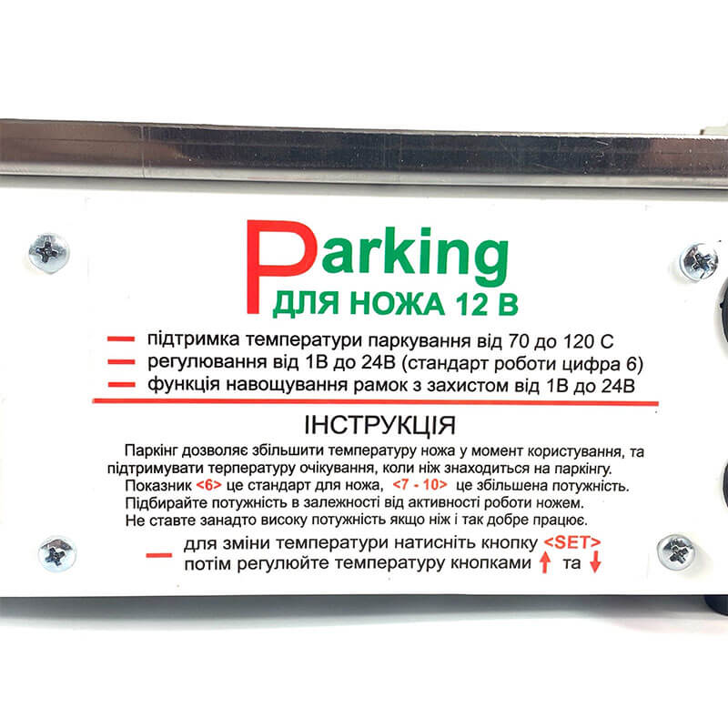 Гарантия – 3 года.ВНИМАНИЕ!!! Паркинг предназначен для работы с ножами «Гуслия» мощностью 40Вт. ЗАПРЕЩЕНО использовать паркинг с ножом Гуслия «Профи», так как у него мощность 70Вт.