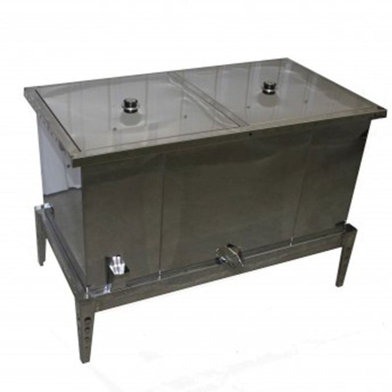 Воскотопка складається з бака, знімних ніжок, 2 кошиків для сировини з ручками. Для зливу воску внизу воскотопки передбачений зливний жолоб. З лівого боку встановлена лійка для заповнення бака водою.Інструкція з експлуатації: У бак заливається 28 літрів води, кошик заповнюють стільниковими рамками та закривають кришкою. Воскотопку поміщають на джерело тепла. Коли вода закипить за допомогою пари, відбувається перетопка воскової сировини.